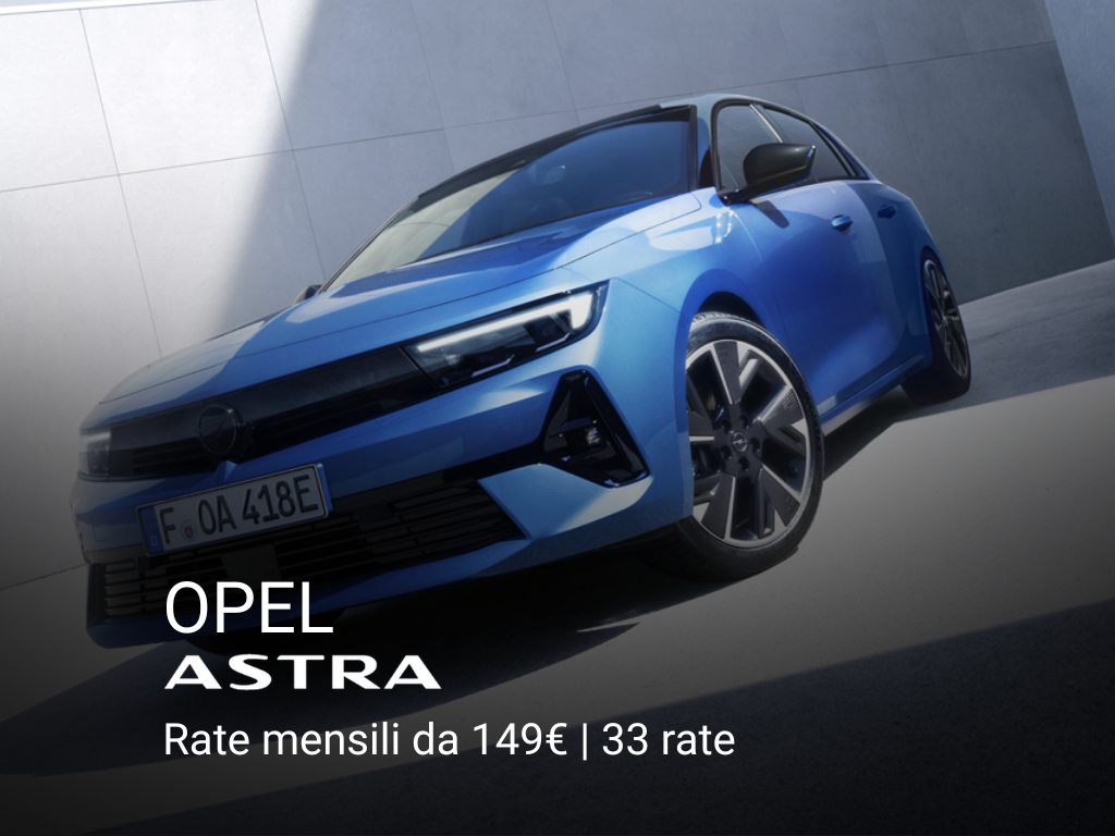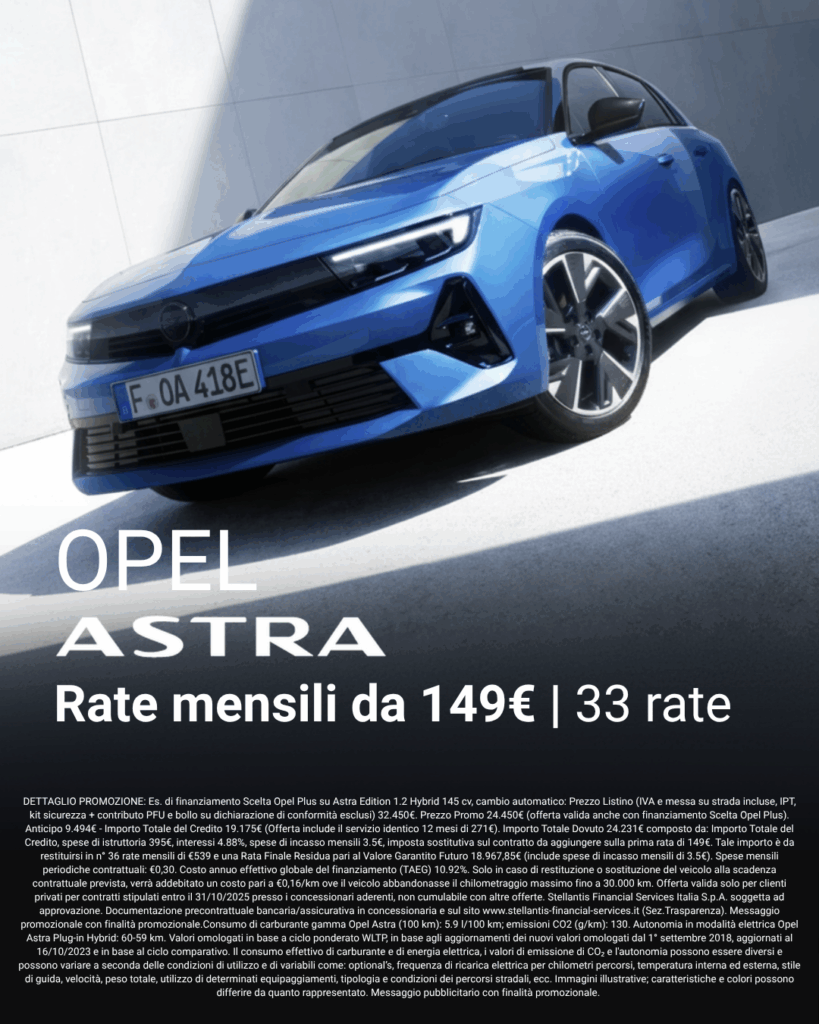 DETTAGLIO PROMOZIONE: Es. di finanziamento Scelta Opel Plus su Astra Edition 1.2 Hybrid 145 cv, cambio automatico: Prezzo Listino (IVA e messa su strada incluse, IPT, kit sicurezza + contributo PFU e bollo su dichiarazione di conformità esclusi) 32.450€. Prezzo Promo 24.450€ (offerta valida anche con finanziamento Scelta Opel Plus). Anticipo 9.494€ – Importo Totale del Credito 19.175€ (Offerta include il servizio identico 12 mesi di 271€). Importo Totale Dovuto 24.231€ composto da: Importo Totale del Credito, spese di istruttoria 395€, interessi 4.88%, spese di incasso mensili 3.5€, imposta sostitutiva sul contratto da aggiungere sulla prima rata di 149€. Tale importo è da restituirsi in n° 36 rate mensili di €539 e una Rata Finale Residua pari al Valore Garantito Futuro 18.967,85€ (include spese di incasso mensili di 3.5€). Spese mensili periodiche contrattuali: €0,30. Costo annuo effettivo globale del finanziamento (TAEG) 10.92%. Solo in caso di restituzione o sostituzione del veicolo alla scadenza contrattuale prevista, verrà addebitato un costo pari a €0,16/km ove il veicolo abbandonasse il chilometraggio massimo fino a 30.000 km. Offerta valida solo per clienti privati per contratti stipulati entro il 31/10/2025 presso i concessionari aderenti, non cumulabile con altre offerte. Stellantis Financial Services Italia S.p.A. soggetta ad approvazione. Documentazione precontrattuale bancaria/assicurativa in concessionaria e sul sito www.stellantis-financial-services.it (Sez.Trasparenza). Messaggio promozionale con finalità promozionale.
